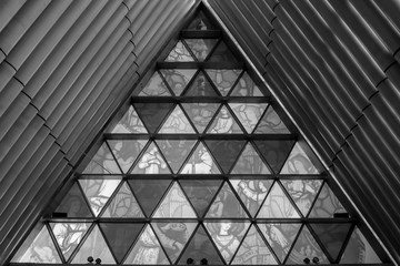 Exterior view of stained-glass gothic window with tracery of cut stone in the Cathedral Church of St Peter in Exeter, February 18, 2017