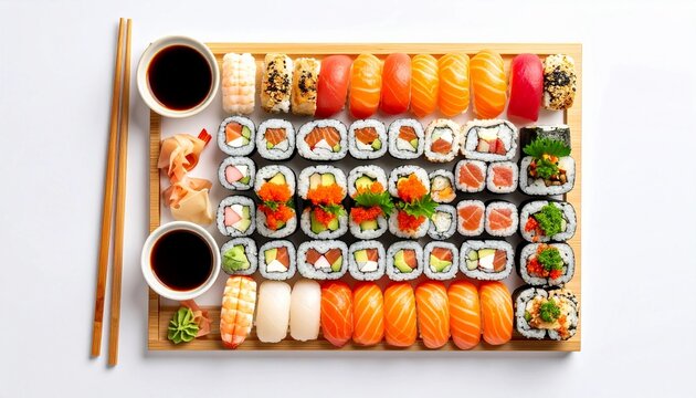 Sushi platter with assorted rolls, soy sauce, and chopsticks, isolated on plain white background, Japanese food concept