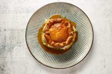 Gourmet chicken dish with sauce and vegetables on elegant plate