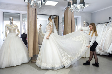 Wedding drees, bridal gown style and bespoke fashion, full-legth white tailored ball gown in showroom, tailor fitting, beauty and wedding