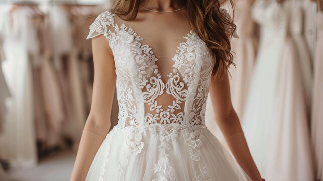 A beautiful bride is trying on a wedding dress in a store