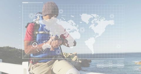 Hiker navigating coastal trail with blue ar hud overlay, outdoor navigation and adventure