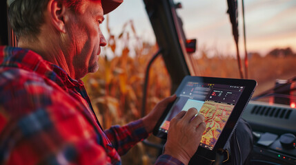 A sprawling farmland network connected by precision agriculture technology, showcasing a vibrant green landscape at sunrise, with a detailed aerial view.