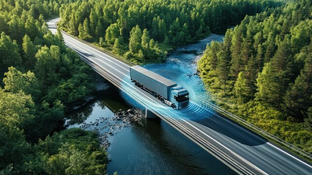 A futuristic truck on the road, an Autonomous truck with artificial intelligence, drives over a bridge over the river Cargo delivery, transportation of the future. Artificial intelligence Self-driving