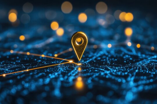 Golden GPS Location Pin on Digital Map with Orange Lines and Blue Background Network