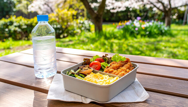 Healthy Picnic Lunch Bento Box and Refreshing Water Bottle on a Table