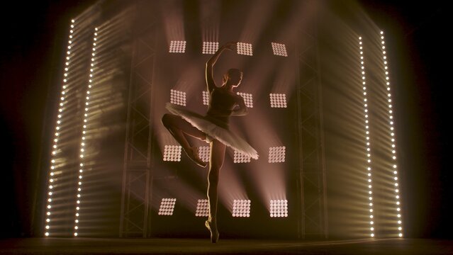 Young ballerina in white tutu dancing in pointe shoes on tiptoes against backdrop of smoke and spotlights with soft white light. Silhouette of flexible woman ballet dancer performing dance pas in dark