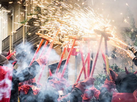 Correfocs (fire runs), demons and fire in the streets of Gracia Festival (Barcelona neighborhood), Catalonia, Spain.