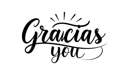 An elegant handwritten design featuring the Spanish word for "thank you," "Gracias," with "you" below, accented by radiating lines
