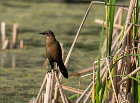 Beautiful shot of a grackle bird on the wooden log in the forest