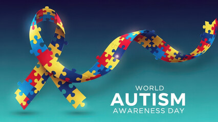 World Autism Awareness Day banner with vibrant puzzle ribbon. Global event concept for autism spectrum support, advocacy, and acceptance, featuring colorful jigsaw pieces on a gradient background.