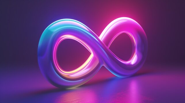 Abstract fluid iridescent holographic neon infinity sign background. Luminous 3D curved shape on gradient backdrop. Futuristic radiant glowing dynamic glass-like element desktop wallpaper.