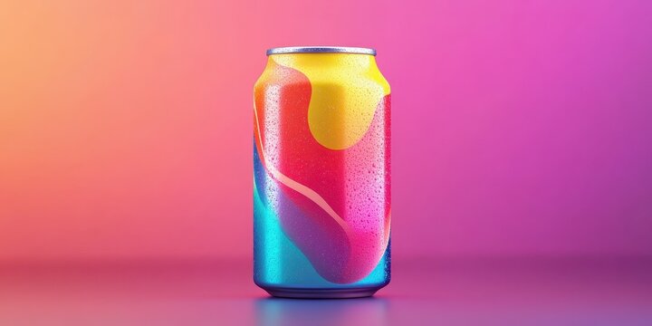 Vibrant soda can with an abstract colorful design on a gradient background.