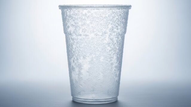 A clear plastic cup with frost covering its exterior against a gradient gray background