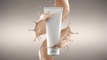 Cosmetic tube splashing in liquid on gray background