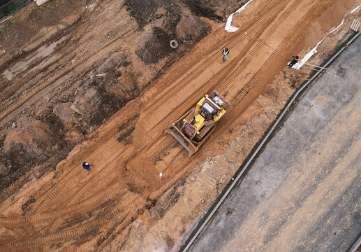 Dozer levels the ground during road construction, aerial view. Compaction of soil for laying asphalt at a construction site. The base course in pavements is a layer of material in a road way.