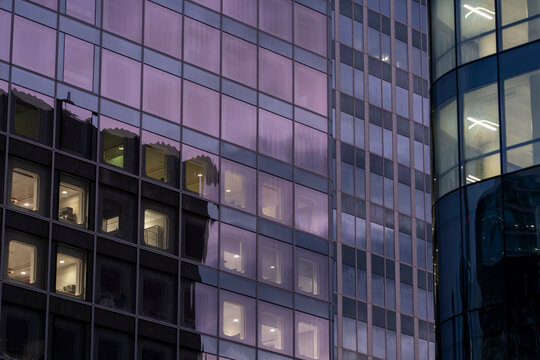 Modern design architecture featuring corporate office windows with reflection across an urban facade under blue hour night light for refined commercial imagery