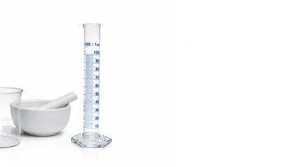 Laboratory glassware with graduated cylinder, beaker, and mortar