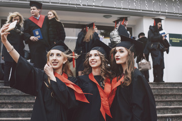 Graduating friends celebrating and taking selfie on bed wearing gowns and mortarboard