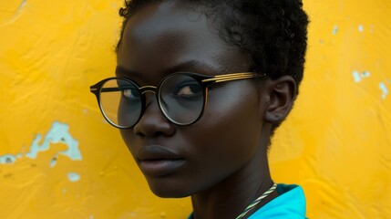 African Woman Wearing Glasses Against Yellow Graffiti Background