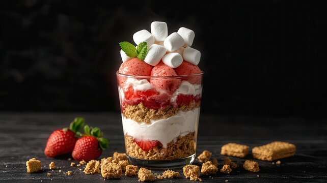 A parfait glass filled with layers of strawberry ice cream, marshmallows, and graham cracker crumbs, photorealistic, hyper-resolution, s mores-inspired delight