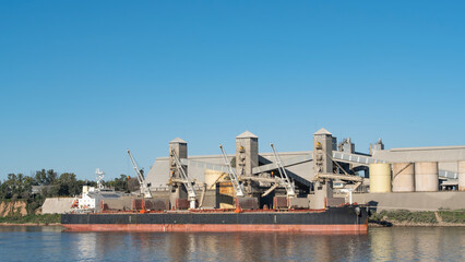 Dry cargo ship at the harbor loading corn for global grain commerce and distribution
