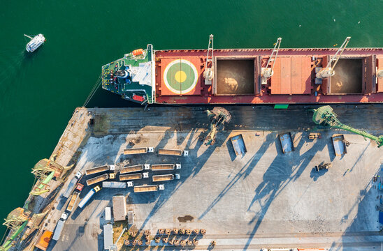 Grain terminals of modern sea commercial port. Silos for storing grain in rays of setting sun. Many trucks are waiting in line for unloading in port harbor, top view from quadcopter. Logistics, trade