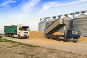 tipper truck unloading grain in a pile near a silo