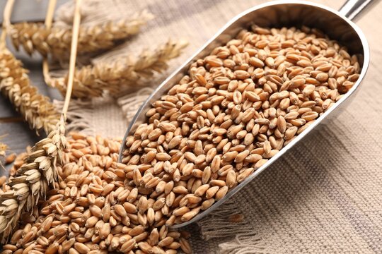 Organic wheat grains scattered on rustic wooden surface create warm and inviting atmosphere, perfect for showcasing natural ingredients