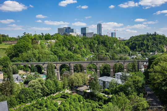Beautiful panoramic view of Old town and Kirchberg district in North-eastern Luxembourg City. Grand Duchy of Luxembourg.