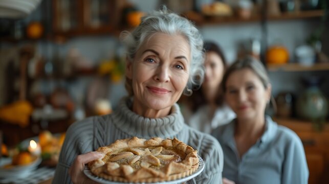 Close up of senior woman serving Thanksgiving pie to her family at dining table.