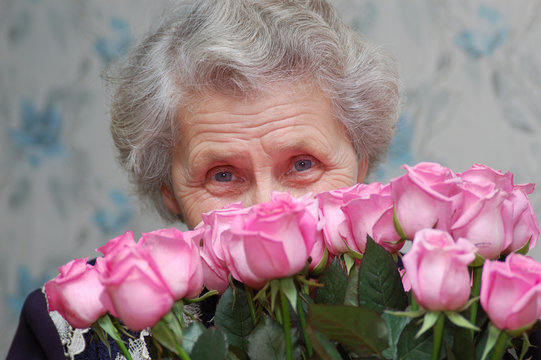 close up face granny behind bouquet of pink rose