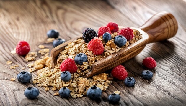 wooden scoop of oatmeal granola with berries on rustic table
