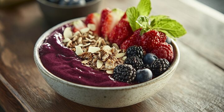 Acai bowl with fresh fruit and granola toppings on a wooden table