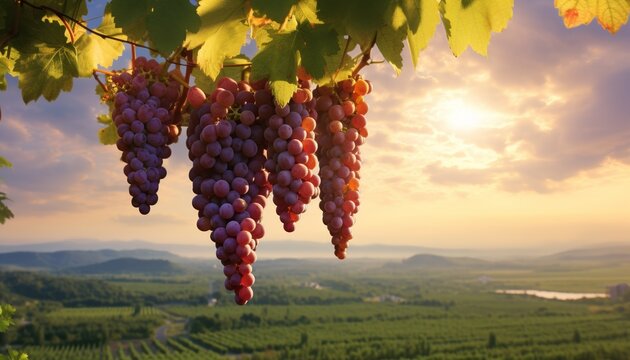 A close up of a bunch of red grapes in a lush vineyard at sunset.