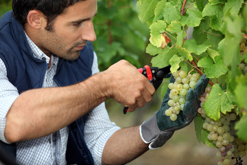 A farmer walks through his vineyard harvesting grapes in french wine country.