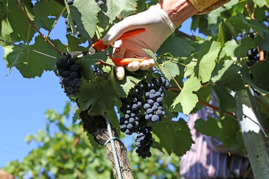 Farmer cutting grapes in the vineyard. Man picking wine grapes on vine in vineyard. Harvest of grapes. Fields vineyards ripen grapes for wine.