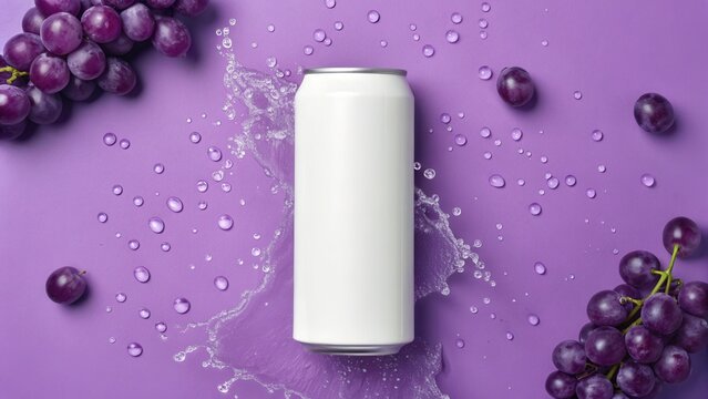 Flat lay white soda can mockup on purple background with grape and water splashing, Fruit soda advertise, Grape juice commercial