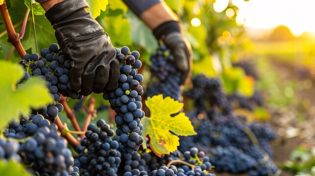 Hands picking Concord grapes in a vineyard with a backdrop of grapevines and the morning sun highlighting the harvest process against a white background Stock Photo with copy space