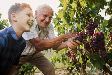 Happy senior is picking grapes with his grandson