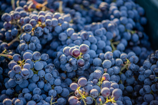 Bucket of grapes during the picking in the vineyard. The name of Cabernet Franc vine grapes in the crate at the harvest season.