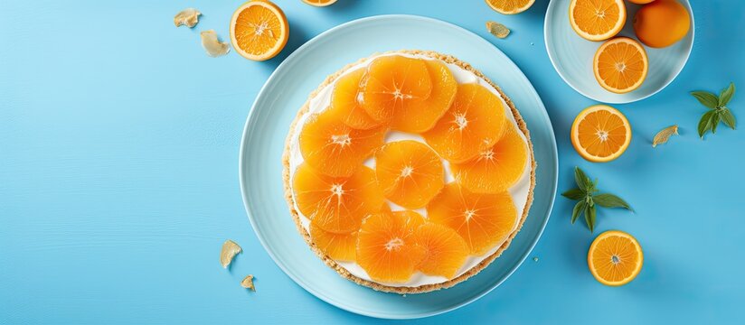Cold homemade orange pie with candied orange orange jam orange mousse and almond cookie seen from above