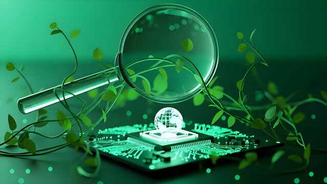 Símbolo antivirus envuelto en vides y circuitos verdes, espacio de copia, tema de ecotecnología, dinámica, manipulación, fondo de diseño ecoconsciente