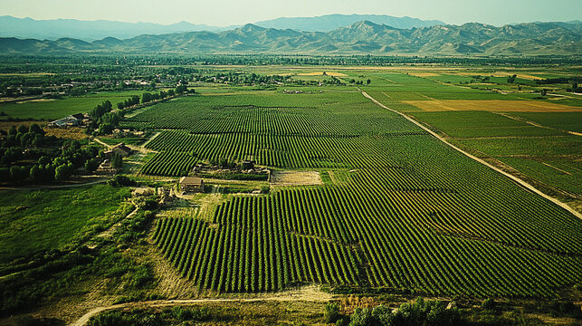 Vineyard landscape captured from above showcasing rolling hills and endless rows of grapevines during clear sunny weather