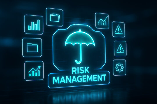 risk management strategy and financial security solution, business planning with data analysis, umbrella protection, and a gear icon symbolizing a well-oiled process