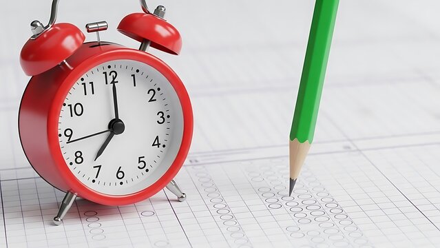 Red alarm clock and green pencil on graph paper