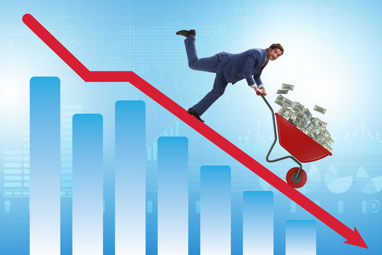 Stack of coins bar chart and red curve graph trending downwards with white wall background on wooden table copy space. Economy recession crisis, inflation, stagflation, business and financial loss.
