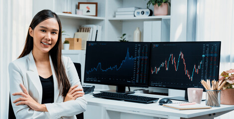 Profile of young Asian businesswoman smiling on happy face with white suit sitting chair against dynamic stock exchange market investing graph on pc showing screen on desk at modern office. Stratagem.