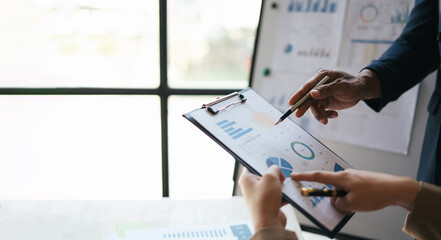 Closeup hands of Business team colleagues working and discussing with various document graph and statistic together in meeting room