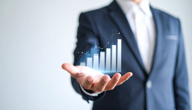 Business wallpaper with a translucent 3D graph shape on the hand of a man in a suit